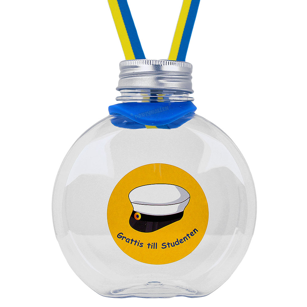 Student Flaska Runt Halsen innehåller en genomskinlig flaska i plast med motiv av en studentmössa som det står "Grattis till Studenten" under. Flaskan rymmer 300ml, har ett skruvbart lock och ett band i gul & blå färg som du kan hänga runt halsen.