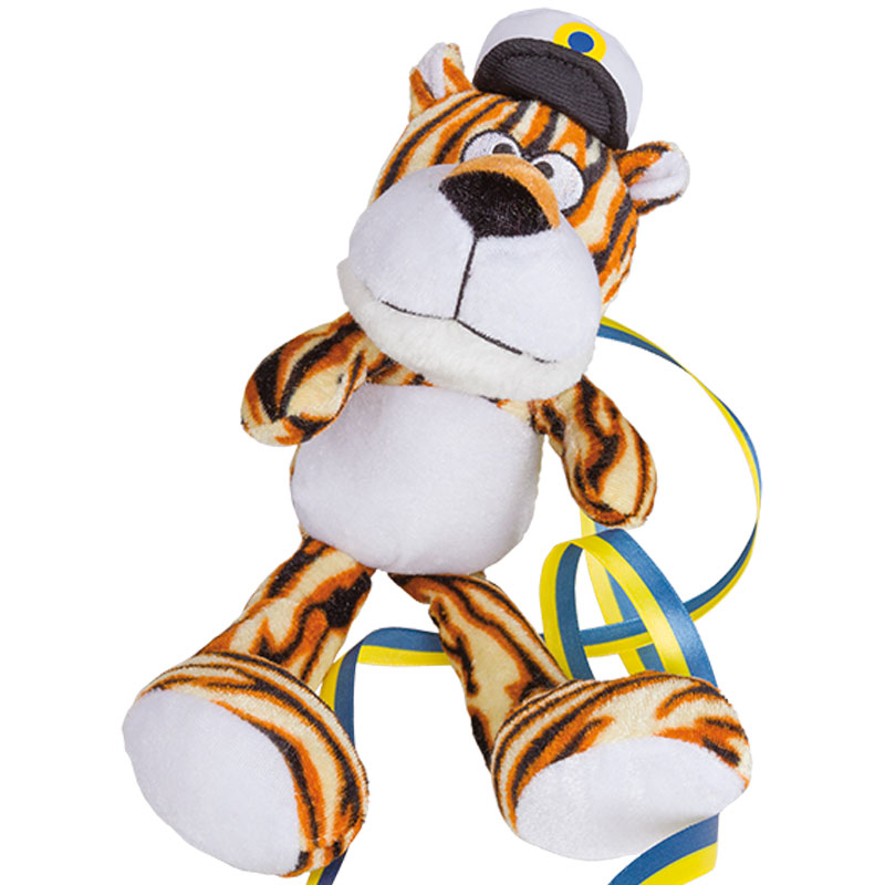 Student Gosedjur Tiger omfattar ett orange- och svartfärgat mjukisdjur i form en tiger med studentmössa på huvudet samt ett blågult nylonband fastsatt vid halsen.