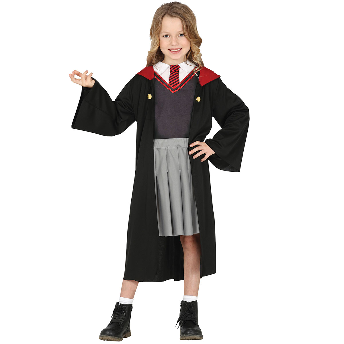 Student Häxa Maskeraddräkt Barn omfattar en barndräkt inspirerad av Gryffindors elevhemsdräkt från Harry Potter. Dräkten består av en svart tunika med luva, en grå kjol, en svart väst med en fastsydd vit skjorta och en randig svartröd slips.