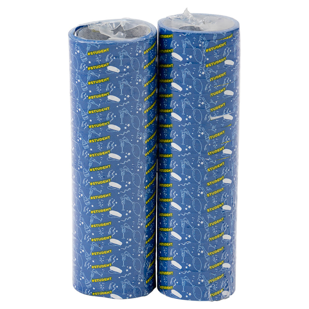 Student Serpentiner Blå består av mörkblå serpentiner med vita studentmotiv och texten "#Student" i gult.