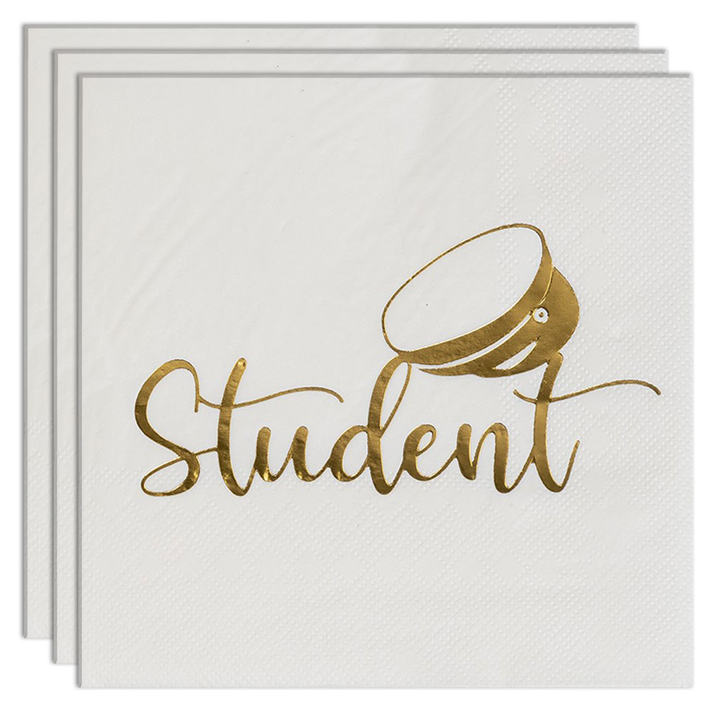 Fullborda din student-dukning och gör den lite extra snygg med hjälp av dessa fina servetter! Snyggt vita servetter med guldig "Student" text som passar perfekt för dig som önskar en både festlig och smutsfri student-dukning. Utmärkta servetter till varje student-dukning i vitt och skimrande guld.