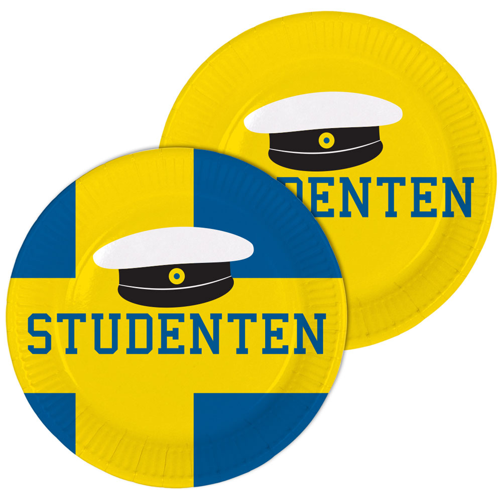 Studenten Engångstallrikar innehåller 8 stycken gul-blå engångstallrikar i papp med texten "Studenten" samt en bild på en studentmössa.