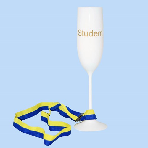 Glaset är i vit plast med guldtexten 'Student' och kommer med ett praktiskt snöre som gör det möjligt att hänga det runt halsen. Både praktiskt och snyggt under studentdagens firande, så att den glada studenten kan njuta av goda drycker hela studentdagen lång! Dessutom blir champagneglaset ett vackert minne att spara när festen är över.