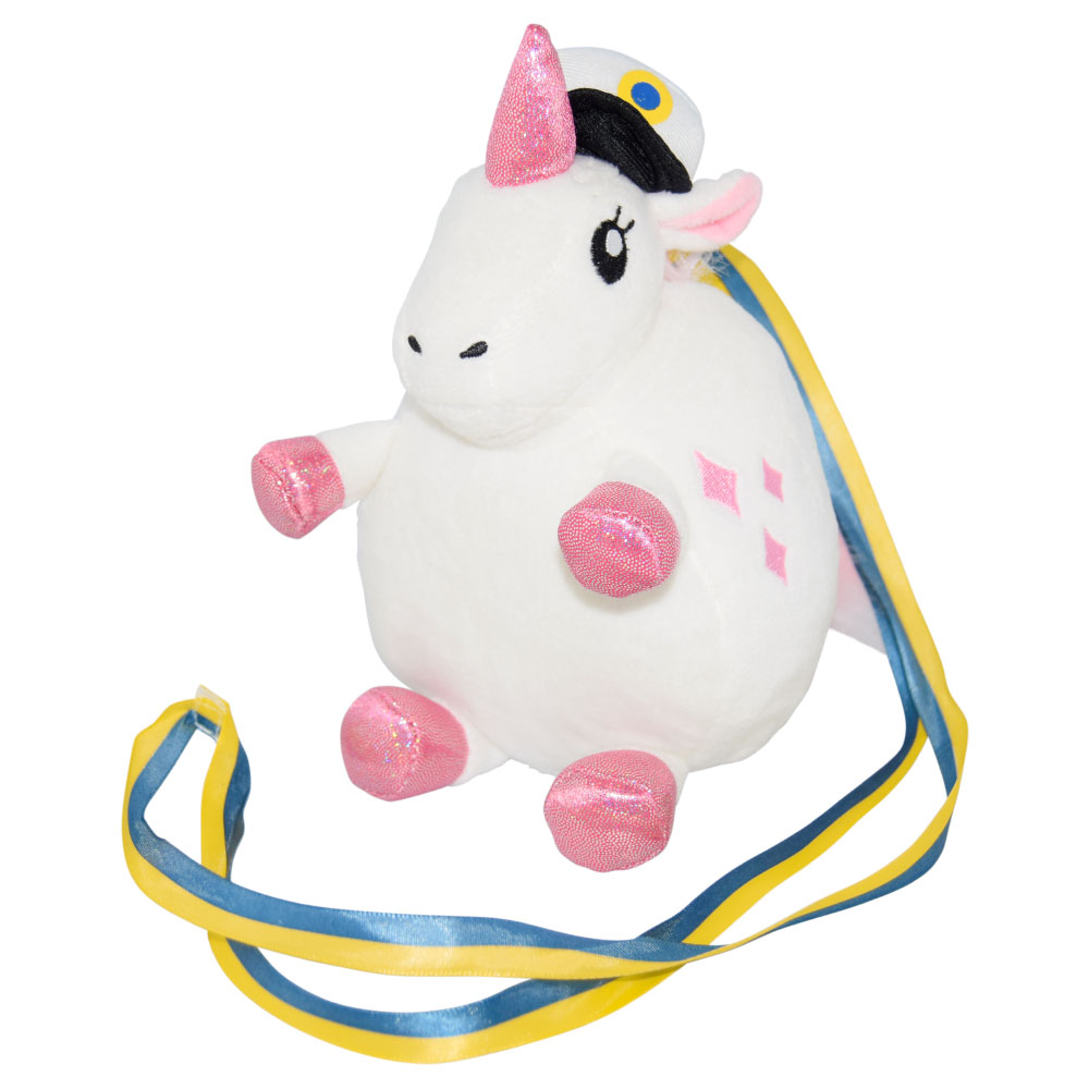 Studentnalle Enhörning omfattar en studentnalle i form av en vit enhörning med glitter-rosa hovar och horn, samt studentmössa och ett blågult band att hänga runt halsen.
