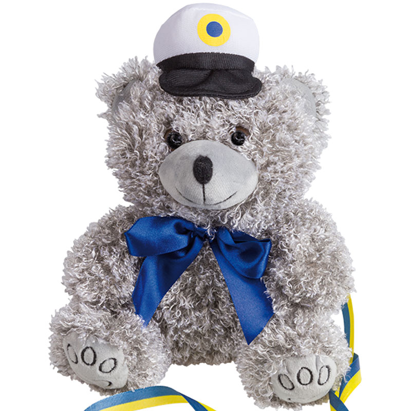 Studentnalle Grå med Rosett omfattar en gråfärgad teddybjörn med krulligt fluff, en studentmössa på huvudet samt en blå rosett frampå. Nallebjörnen kommer även med ett blågult nylonband som kan hängas kring halsen.