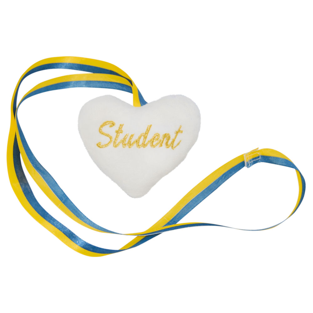 Studentnalle Litet Hjärta omfattar en student halsband i form av ett litet hjärta i vitt och text "Student" broderat i guld, med ett blågult band att hänga runt halsen.