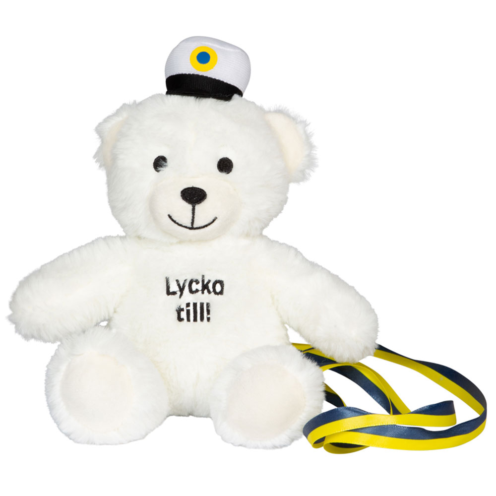 Studentnalle Lycka Till! med Band 26cm omfattar ett mjukisdjur i form av en vit björn med texten "Lycka till!" i svart. Nallebjörnen har även ett band i blå och gul att hänga runt halsen och bär en studentmössa.