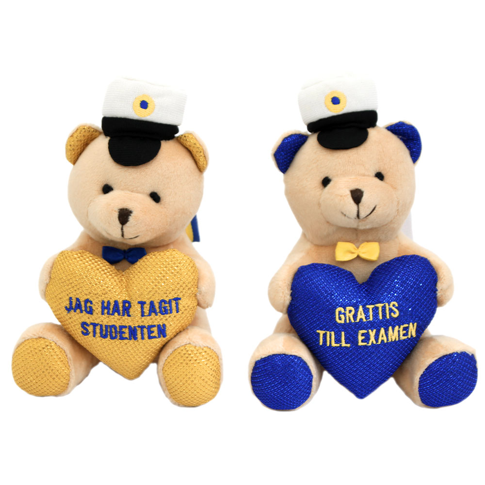 Studentnalle med Hjärta består av en ljusbrun nallebjörn med studentmössa på huvudet. Baktill sitter ett klassiskt blå-gult halsband med kardborre-knäppe. Nallebjörnen är i plysch och mäter ca 14 (H) x 6 (B) cm. Studentnallen finns i två olika motiv, den ena med texten "JAG HAR TAGIT STUDENTEN" och den andra "GRATTIS TILL EXAMEN". Vilken av dessa du får blir en överraskning.