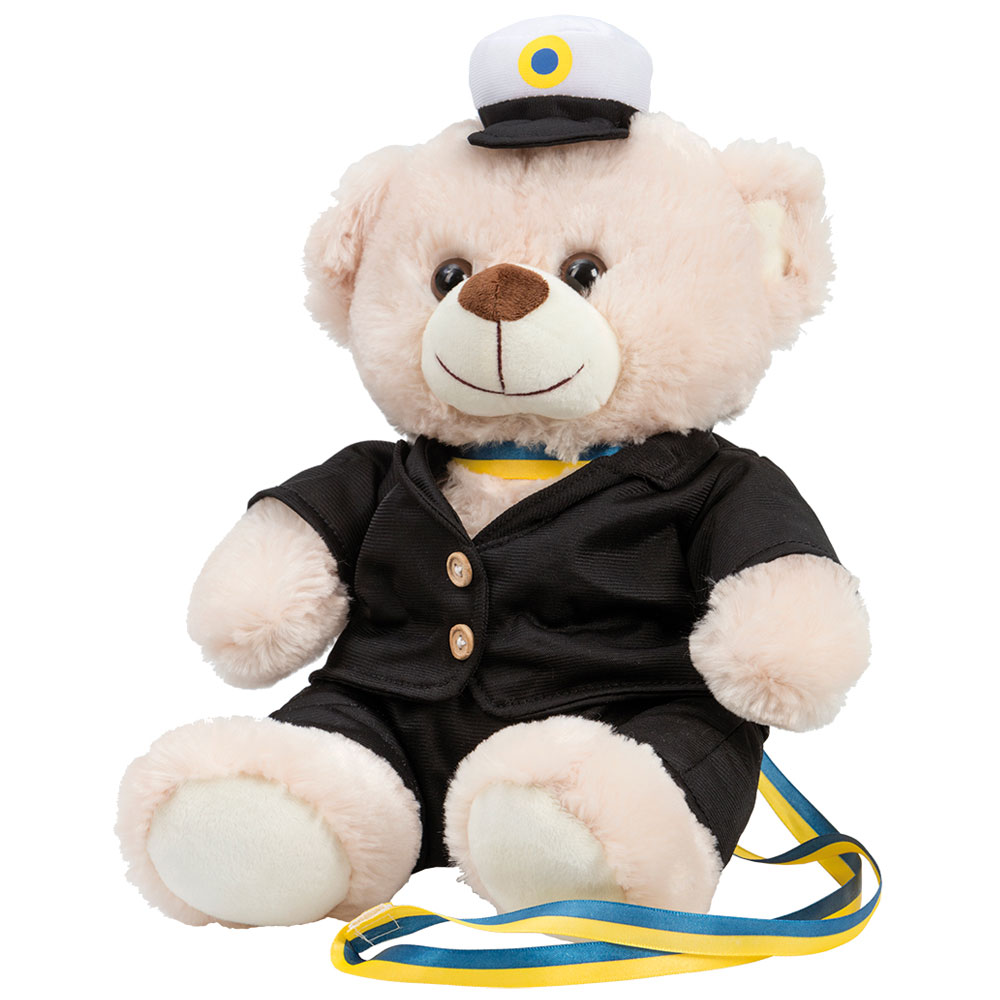 Studentnalle med Kostym är en lite större beige nalle med studentmössa och svart kostym med två knappar framtill. Ingår även ett blå-gult band att hänga nallen runt students hals.
