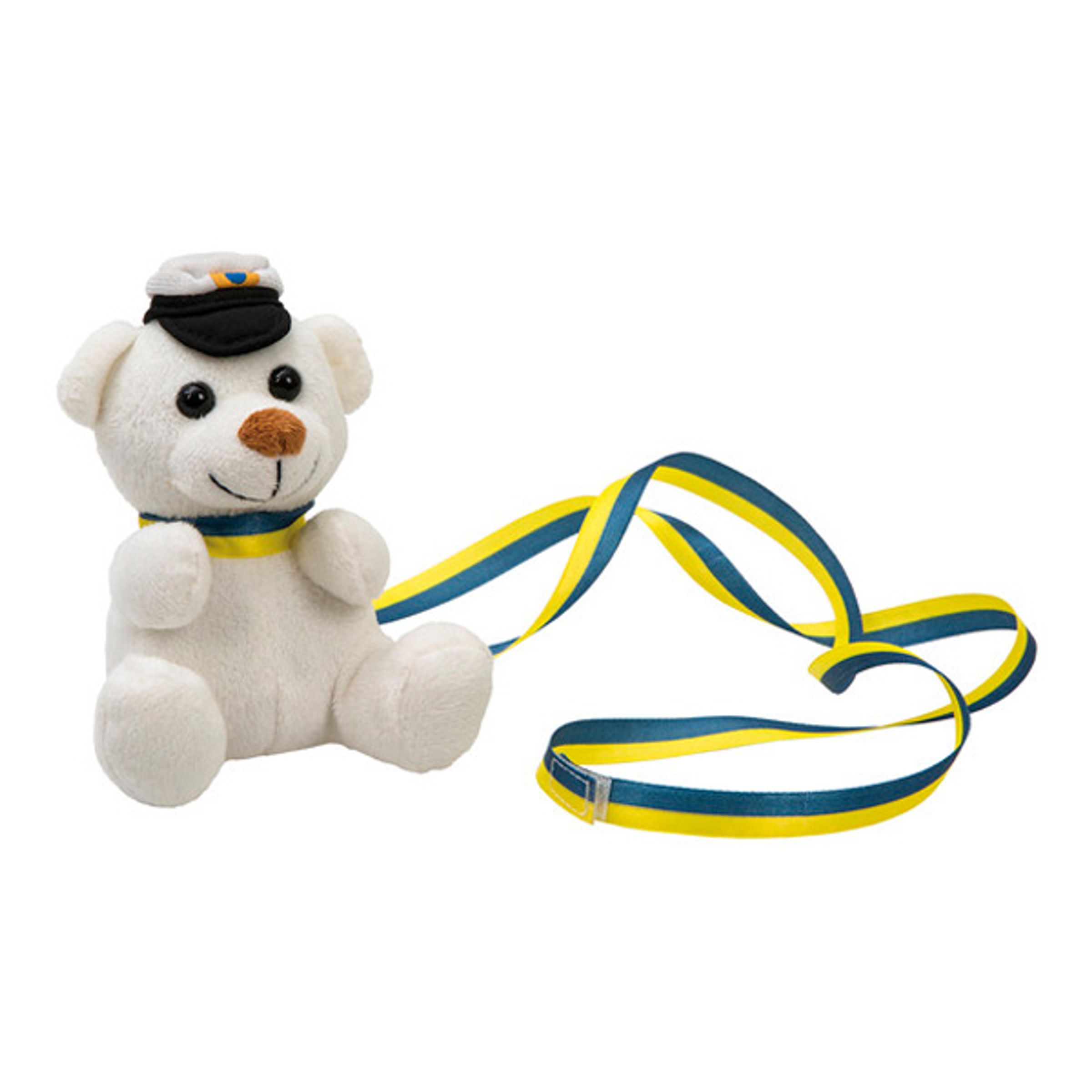 Nallen sitter fast på ett långt blågult band och har en liten studentmössa på huvudet, och mäter 13 cm hög.