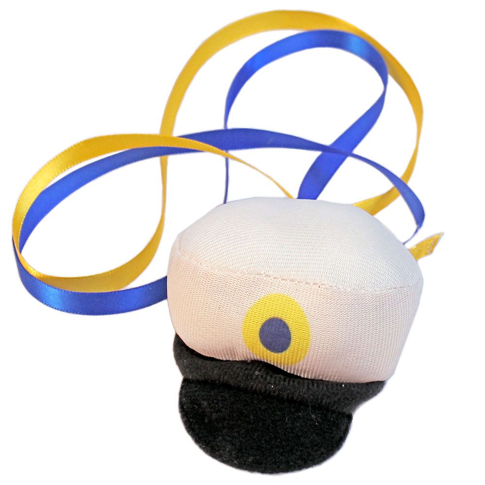 Studentnalle Mössa är en mjuk liten studentmössa i vit och svart med ett blå/gult band att hänga runt halsen.