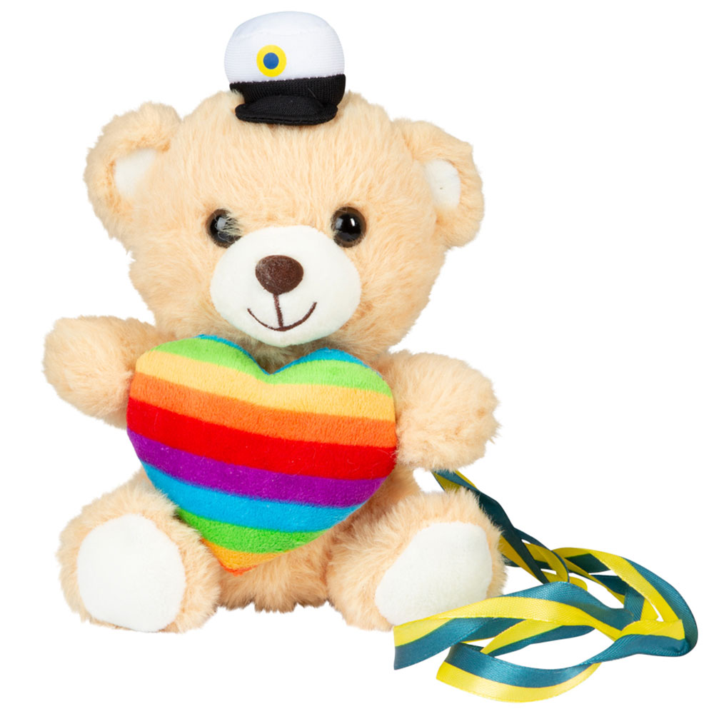Studentnalle Pride med Band 18cm omfattar ett mjukisdjur i form av en ljusbrun björn med ett band i blå och gul att hänga runt halsen. Nallebjörnen håller ett hjärta i regnbågsfärger och har på sig en studentmössa.