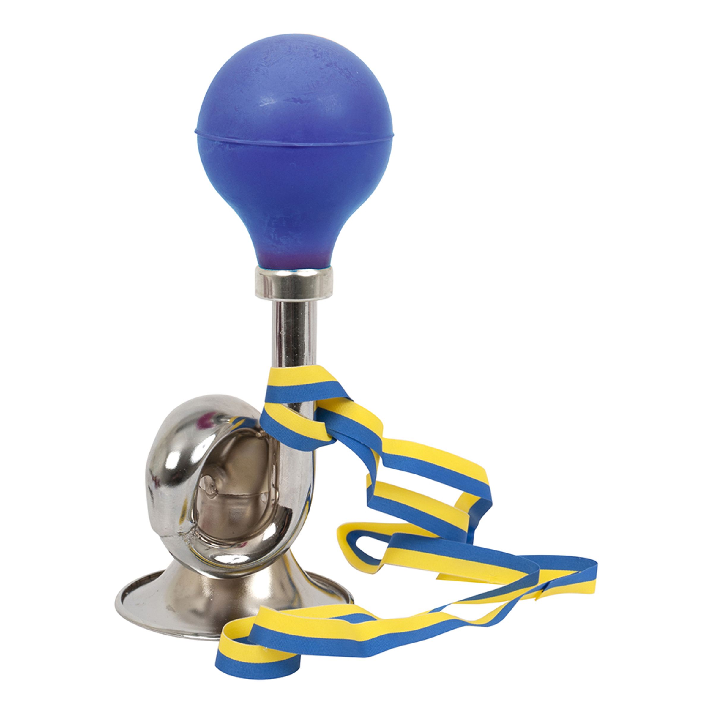 Studenttuta med Band är en snygg och rejäl studenttuta i metall och gummi med ett gult och blått band att hänga kring halsen.