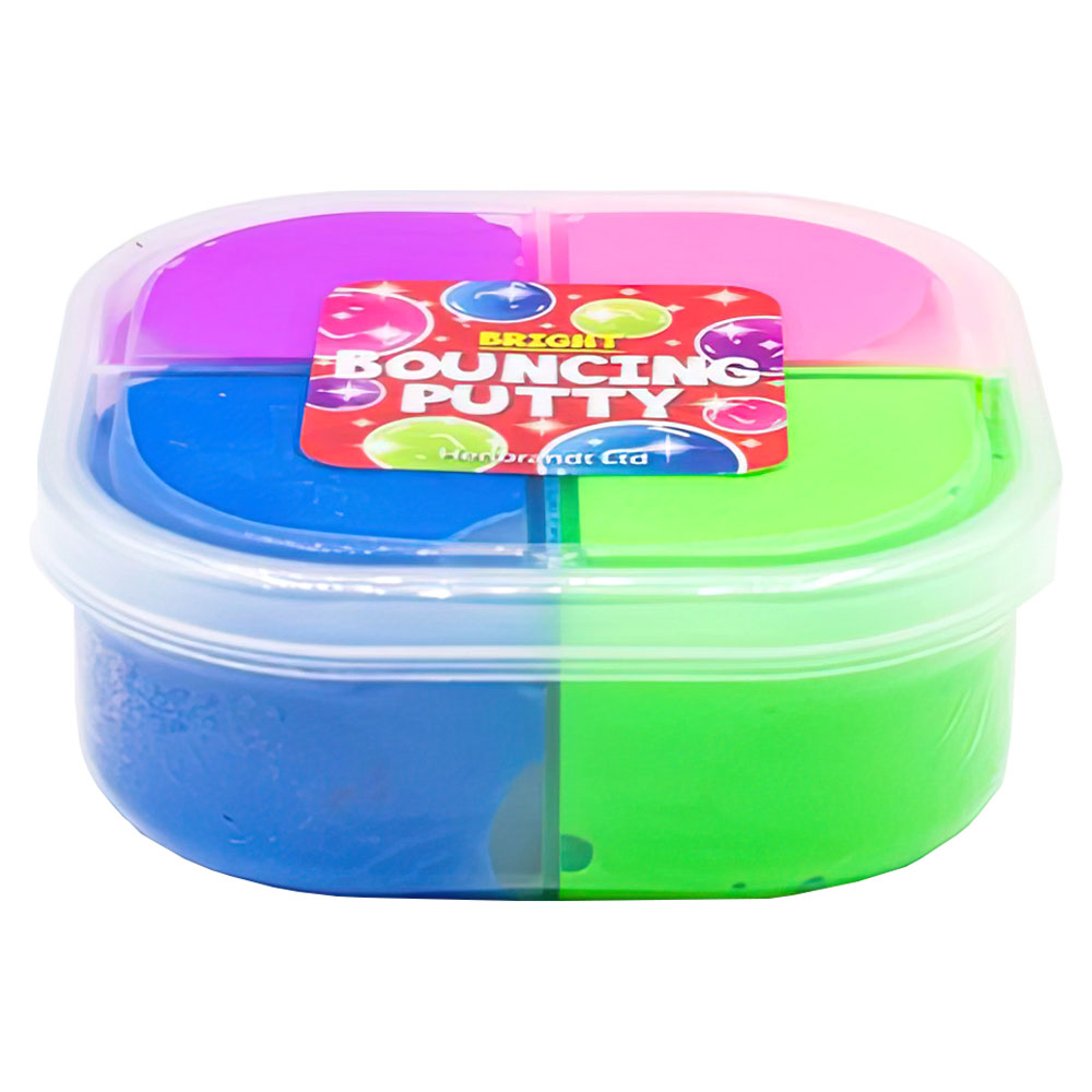 Studsande Slime omfattar studs-slime i blått, grönt, lila och rosa. Slimet kan knådas, formas och blandas för att skapa andra färger.