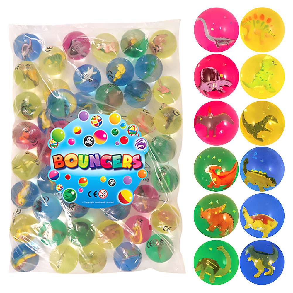 Studsboll Dinosaurie omfattar en 4,3 cm stor studsboll med en dinosauriefigur inuti. Studsbollen finns i 4 olika färger och med 12 olika dinosauriefigurer, vilken du får blir en överraskning.