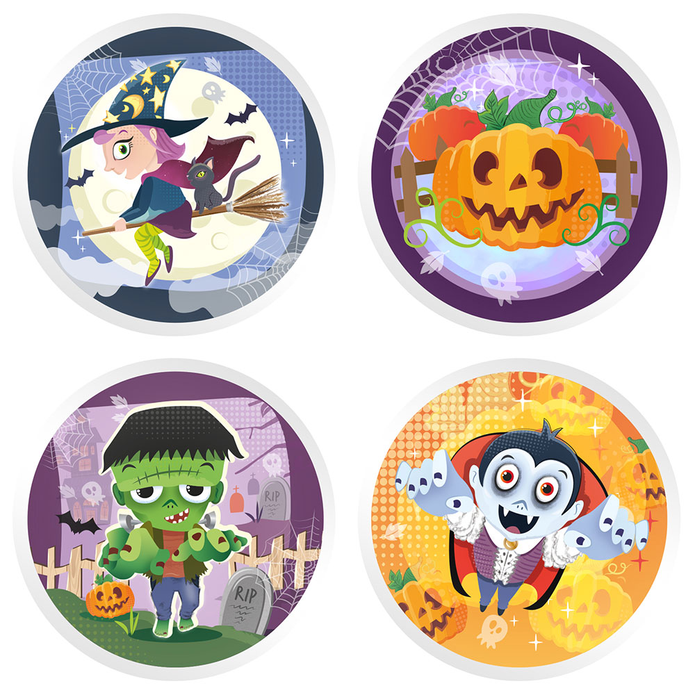 Studsboll Halloween omfattar en studsboll som finns i fyra olika Halloweenmotiv: pumpa, zombie, vampyr och häxa.