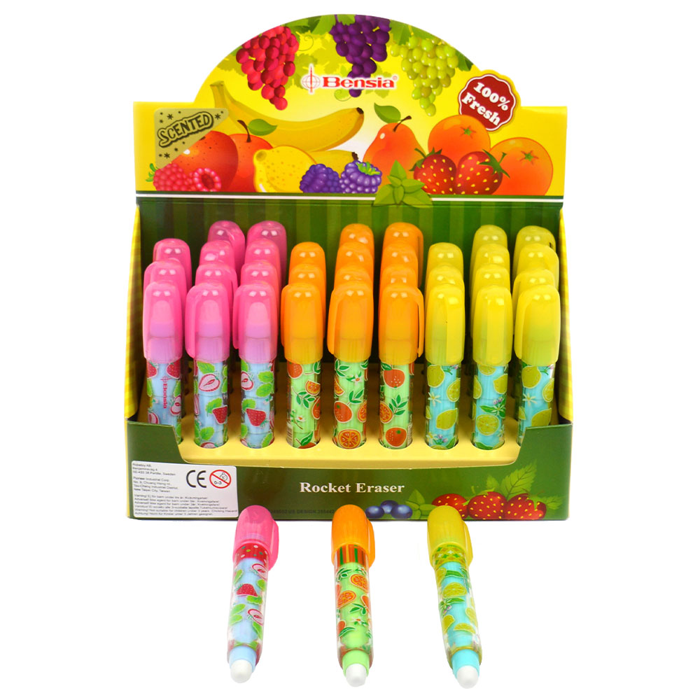 Suddpenna Frukt med Doft omfattar en tjock penna med fem stycken suddgummin med fruktdoft. När ett av sudden är slut sätter du behållaren längst bak i pennan och nästa sudd skjuts ut. Finns i tre olika dofter, vilken du får blir en överraskning.