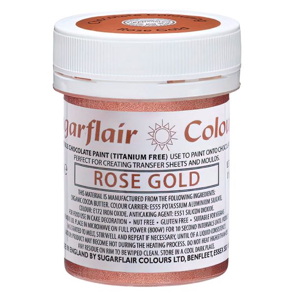 Med Sugarflair chokladfärg i roséguld dekorerar du dina praliner, tårtor och andra bakverk för att få den där extra lyxiga looken! Denna choklad-färg är ätbar och för att använda den så behöver du smälta den, sen är det bara att sätta igång att dekorera och pynta med vackert roséguld på dina bakelser.