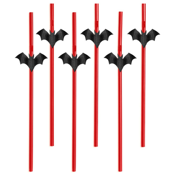 Sugrör Fladdermöss innehåller 6 stycken röda sugrör med svarta fladdermöss i papp. Sugrören är tillverkade i plast.