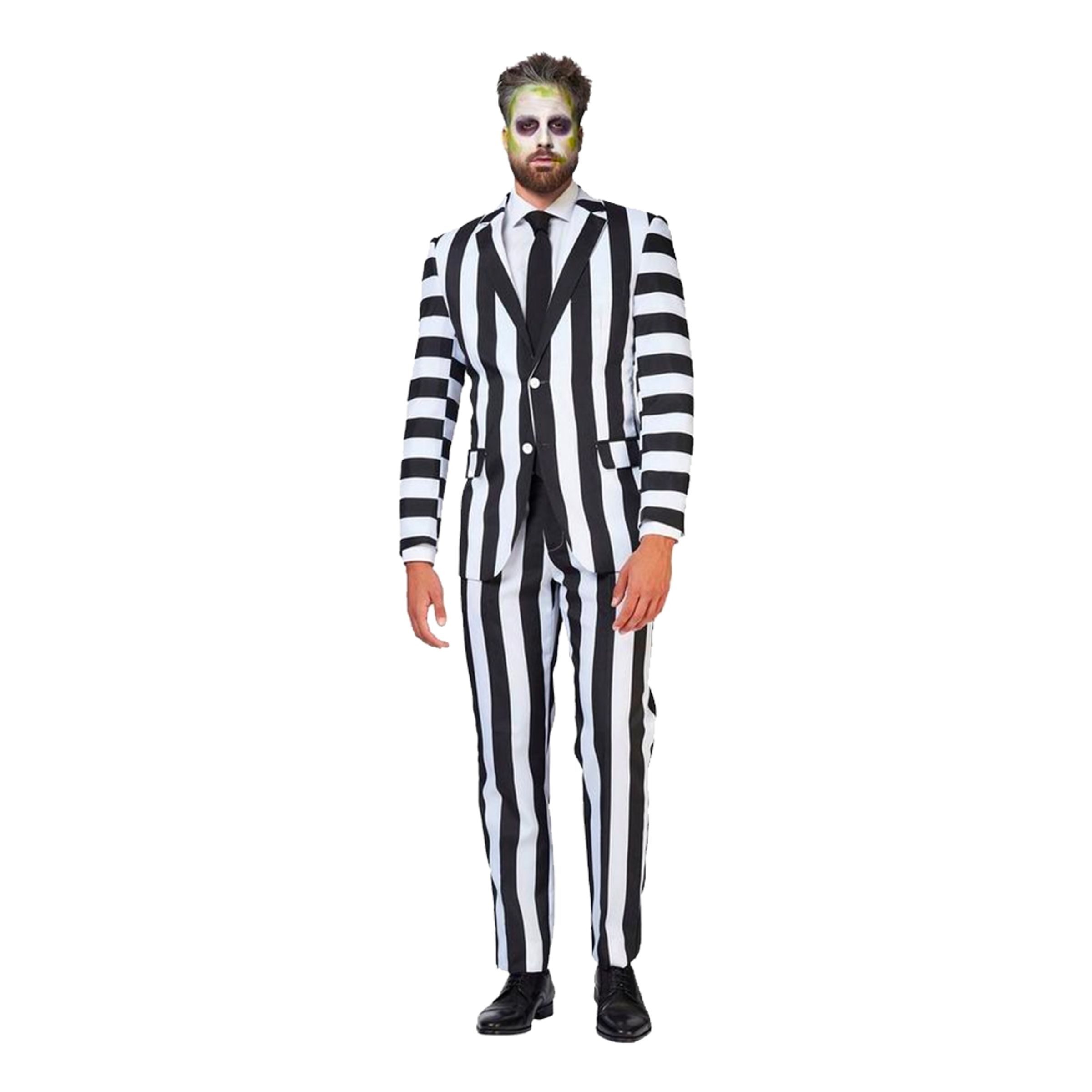 Suitmeister Beetlejuice Kostym inkluderar en svart- och vitrandig kavaj med fickor och vita knappar samt ett par matchande kostymbyxor. Medföljer gör även en svart slips. Matcha med vit skjorta, peruk och smink för en komplett look. En ypperlig outfit för tv- och filmmaskeraden eller halloweenfesten!