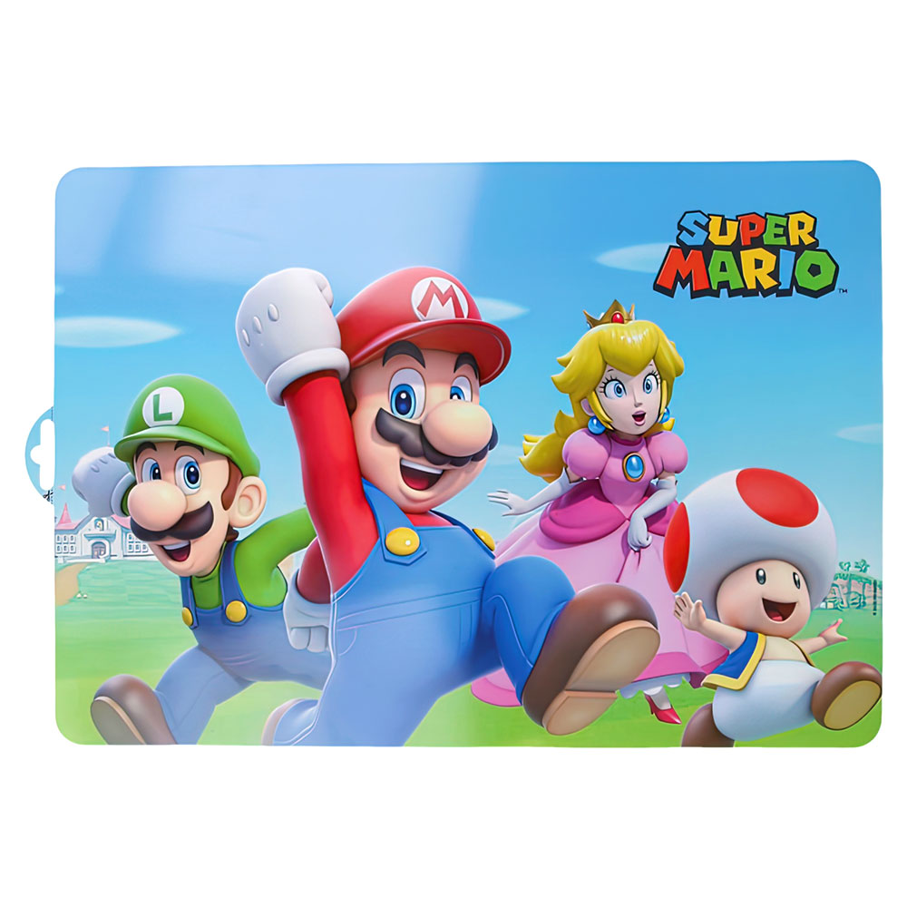 Super Mario Bordsunderlägg omfattar en bordstablett i plast med Super Mario motiv och text. Motivet föreställer karaktärerna Super Mario, Luigi, Toad och Peach med texten "Super Mario" i olika färger.
