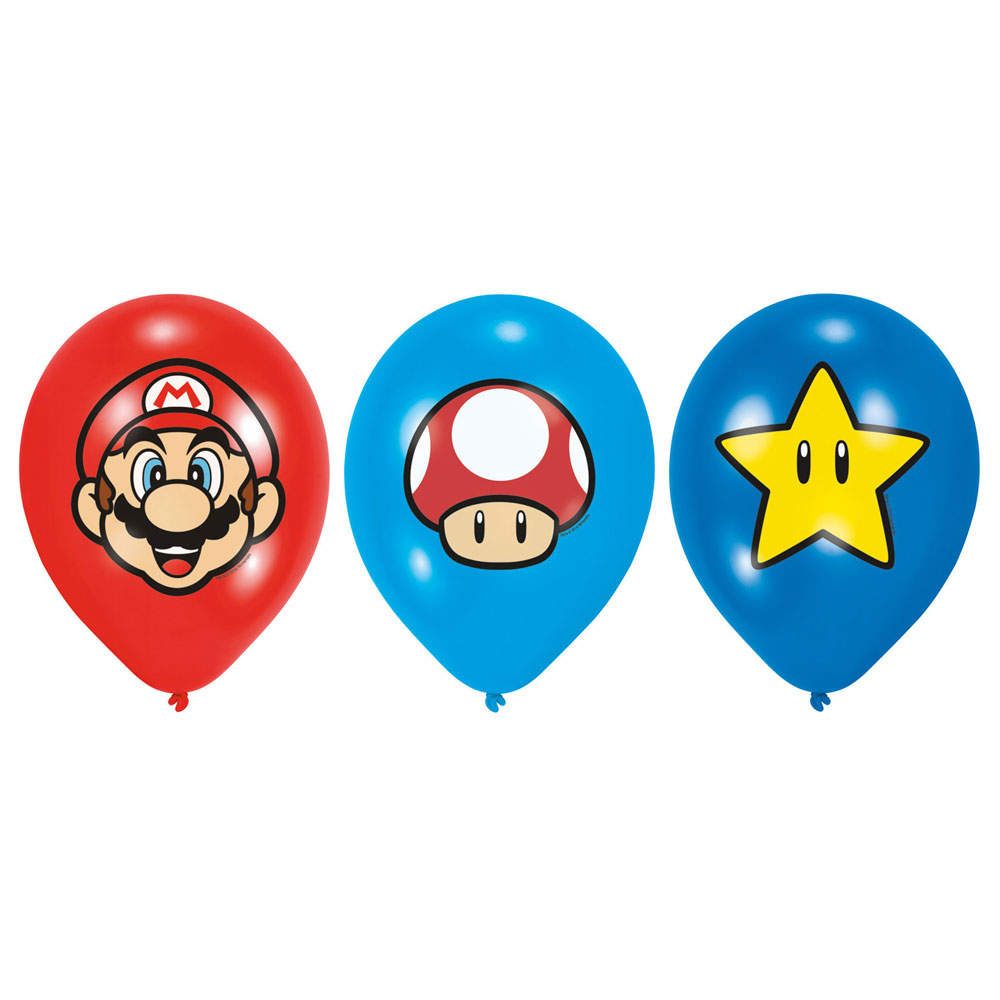 Super Mario Latexballonger består av 6 stycken latexballonger i rött, ljusblått och blått med tre olika Super Mario motiv.