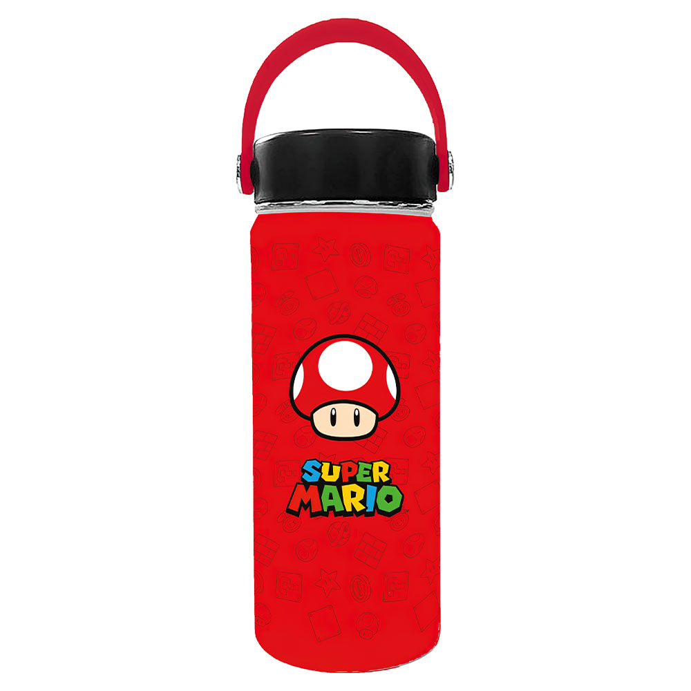Super Mario Termosflaska omfattar en röd termosflaska med svart skruvlock och handtag med texten "Super Mario" i olika färger och motiv av karaktären Toad med konturer av olika saker som figurerar i Nintendo världen. Termosflaskan rymmer 530 ml och håller kylan och värmen i upp till nio respektive åtta timmar.