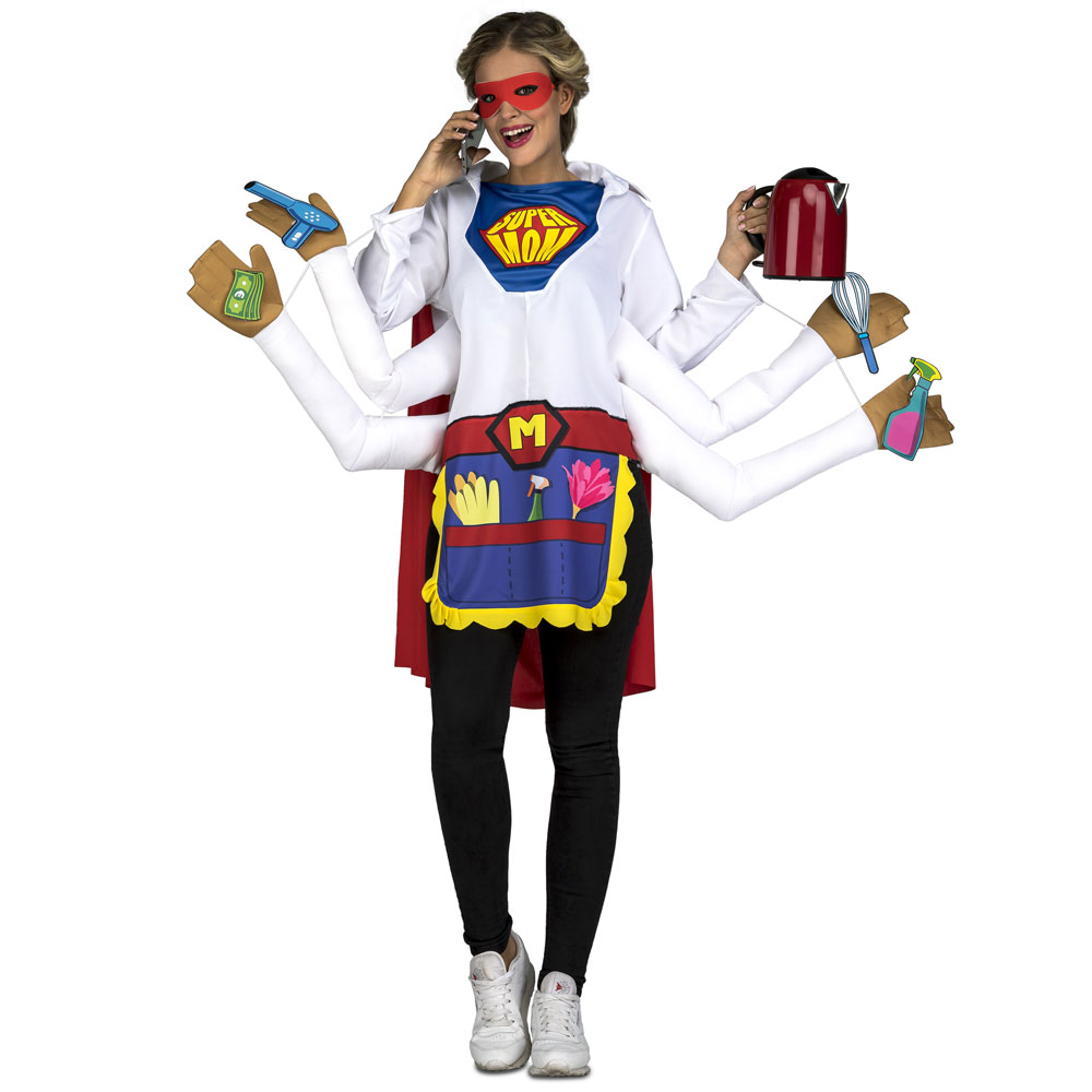 Super Mom Maskeraddräkt innehåller en rolig Super Mom maskeraddräkt i vitt med röd cape och texten "Super Mom" på bröstet, samt ett tryck av ett förkläde med städgrejor på nederdelen. Dräkten har även 4 stycken extra uppstoppade fejk-armar som hänger i trådar från dräktens ärmar. Ingår även låtsas-hörfrön, låtsas-pengar, låtsas-visp och låtsas-sprayflaska som kan fästas i fejk-armarnas händer med kardborreband.