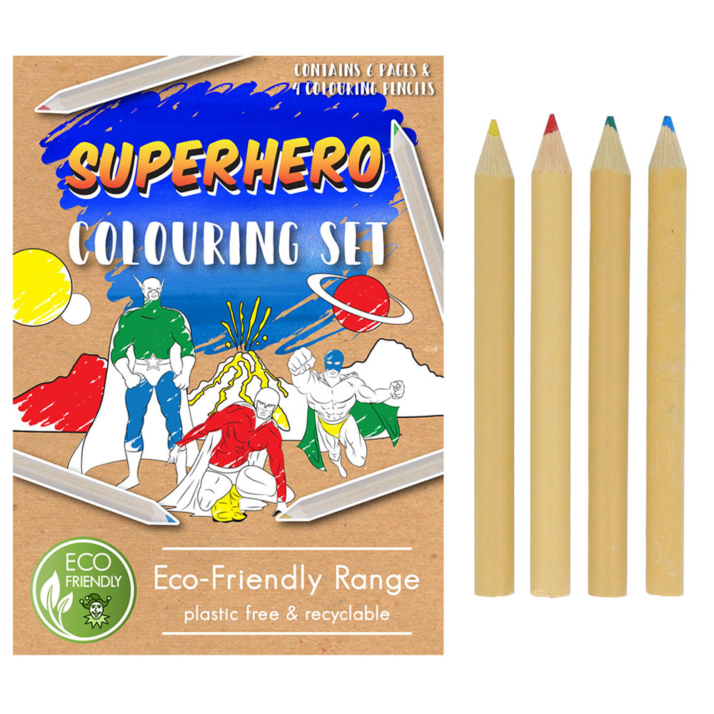 Superhjälte Målarset Eco omfattar ett kit med sex stycken målarblad med olika superhjältemotiv samt fyra stycken mini färgpennor i färgerna blå, grön, röd och gul. Produkten är miljövänlig, plastfri och återvinningsbar.