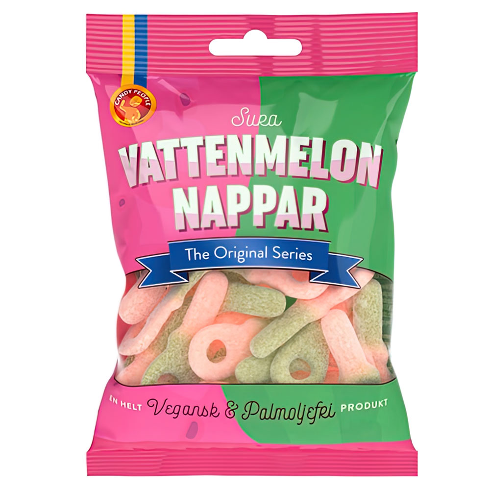 Sura vattenmelon nappar är ett gelatinfritt, veganskt surt godis i påse som innehåller sur gelégodis som smakar meloner. Sura vattenmelon nappar är ett godis utan palmolja som är lika gott att äta på kalas som på fredagsmyset.