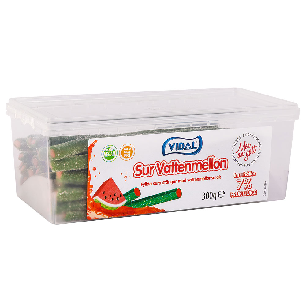Sura Vattenmelonstänger består av 300 gram fyllda sura godisstänger med vattenmelonssmak. Godiset är veganskt och palmoljefritt.