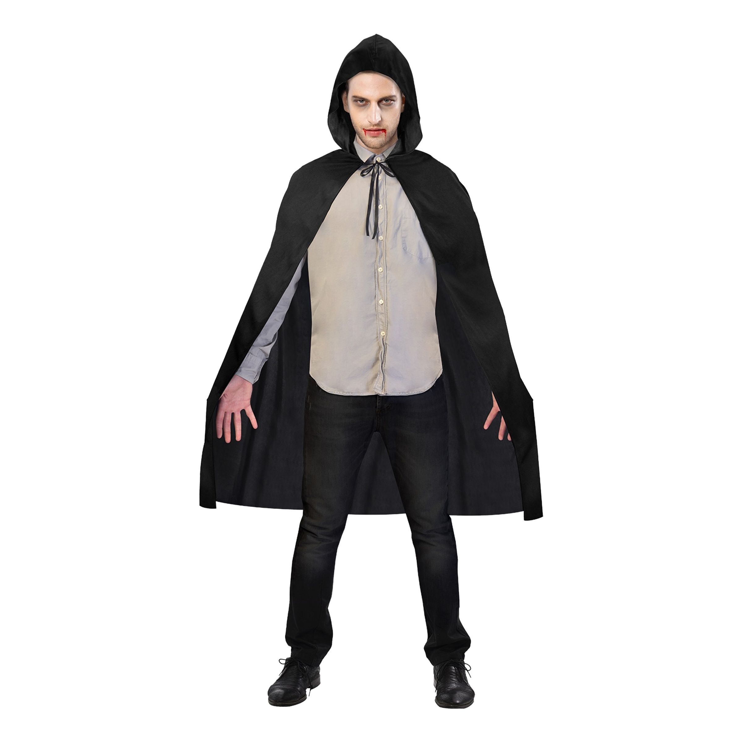 Svart Cape med Huva är en mantel i svart med en huva. Knyt fast den i halsen så den håller sig på plats hela kvällen lång. Perfekt till alla maskerader som komma skall!