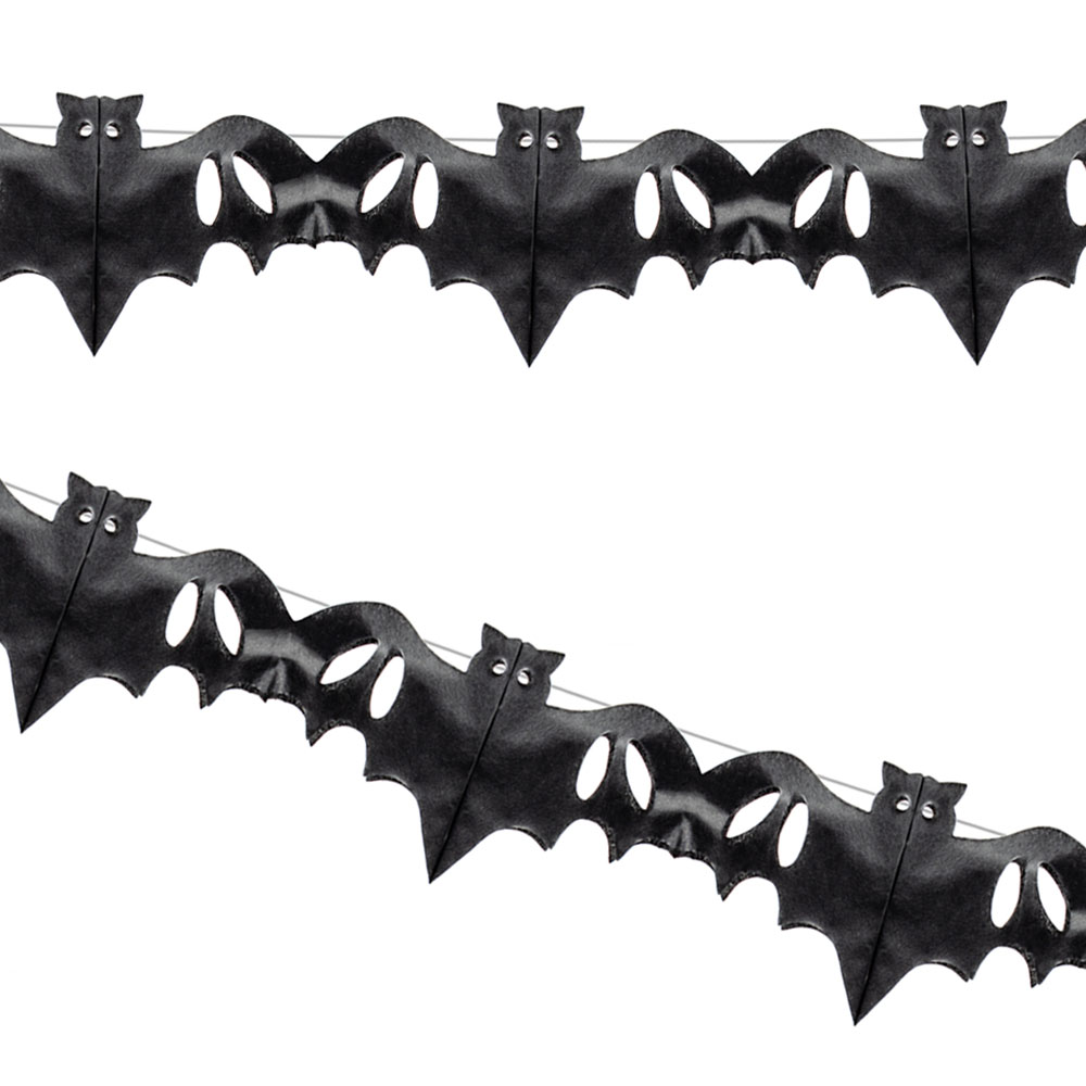 Svart fladdermus Girlang innehåller en svarta girlang i form av en lång rad fladdermöss. Fladdermössen sitter fast på ett vitt snöre som du även kan använda för att hänga upp girlangen med. Tillverkad av papp.