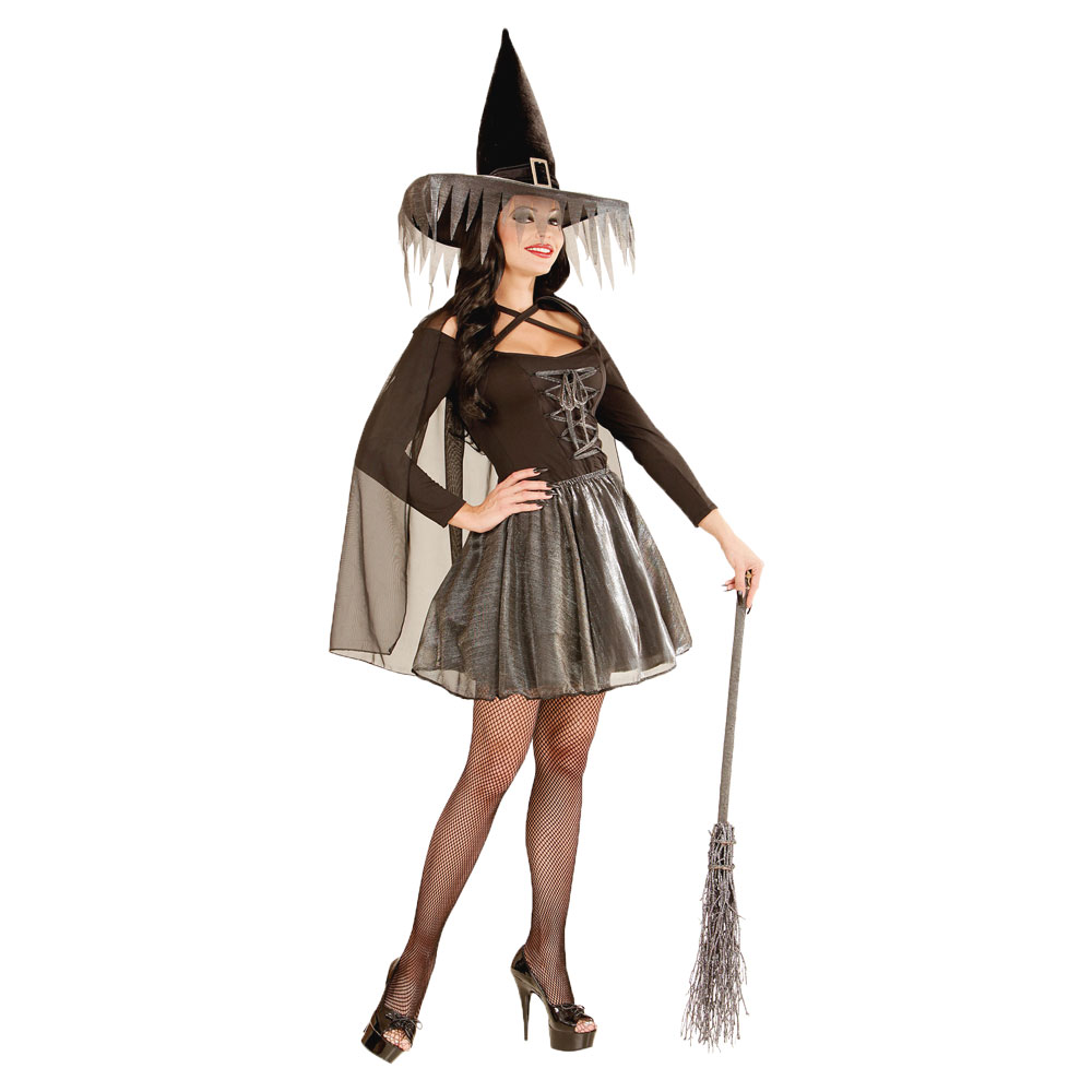 Häxdräkt Svart omfattar en svart häxdräkt i polyester för vuxna. Dräkten kommer med en tröja med snörning framtill, en kort, tunn mantel, en skimrande kjol samt en matchande häxhatt.