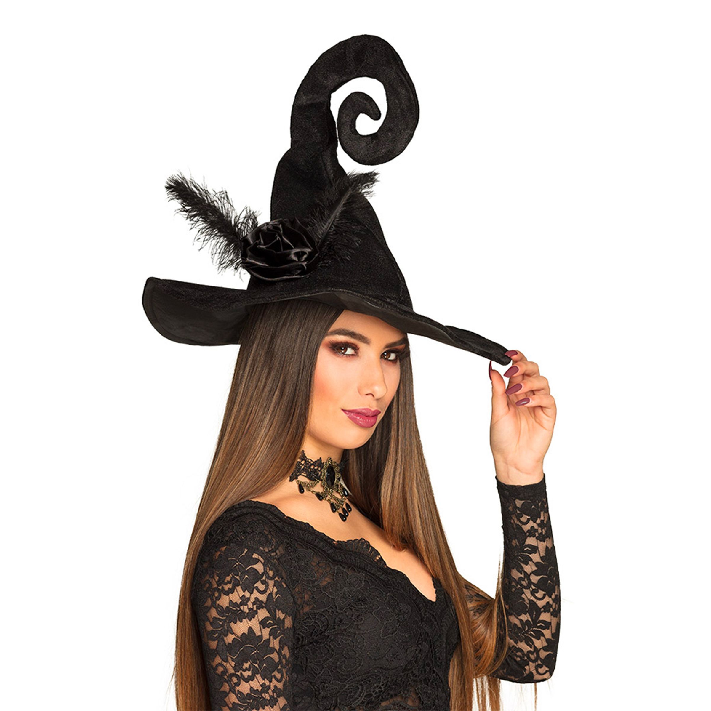 Svart Häxhatt med Blomma är en svart hatt i onesize som har en lång snurrad topp med en blomma längst skärmen.