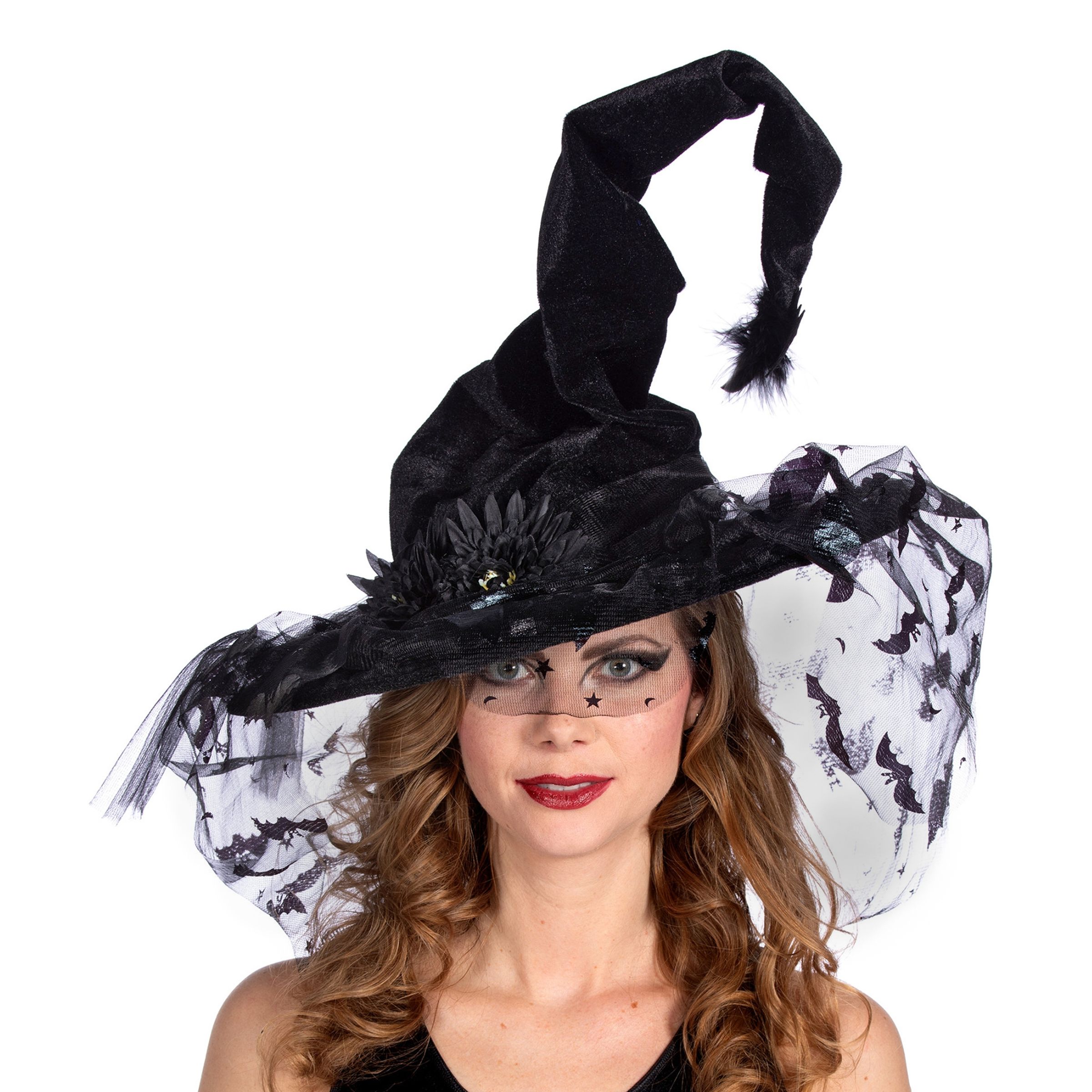 Svart Häxhatt med Fladdermöss är en svart krokig häxhatt i velour och tyg som hänger ned runt hattens kant prydd med fladdermöss. Komplettera med en svart klänning och du är redo för att sprida kusliga trollformlar!