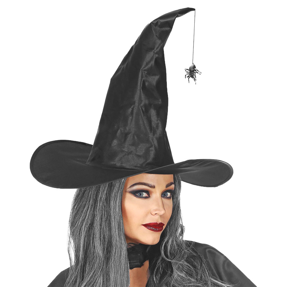 Svart Häxhatt med Spindel omfattar en svart häxhatt i polyester med en läskig spindel som hänger från toppen. Hatten kommer i vuxenstorlek.
