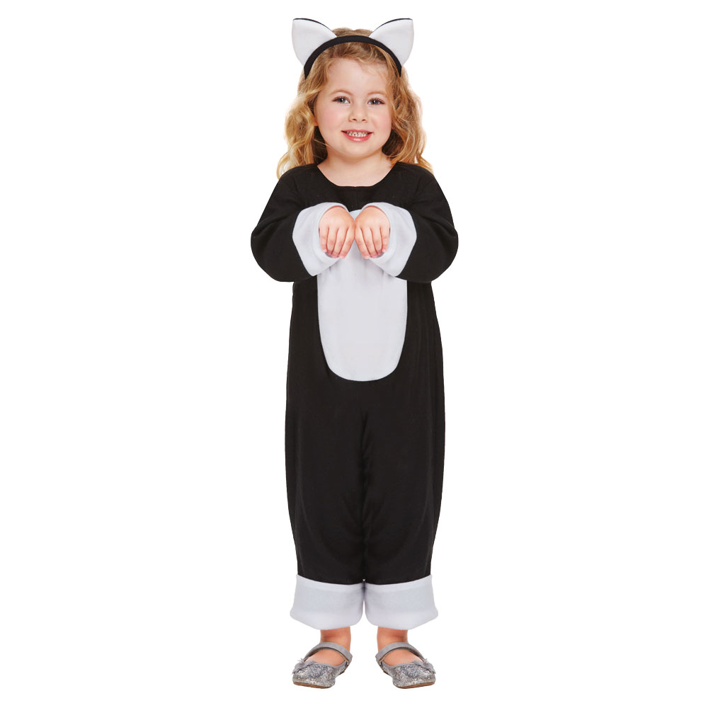 Svart Kattdräkt Barn 3 år omfattar en svart kattdräkt med vita detaljer, lång svans samt matchande kattöron. Dräkten är tillverkad av polyester och passar barn.