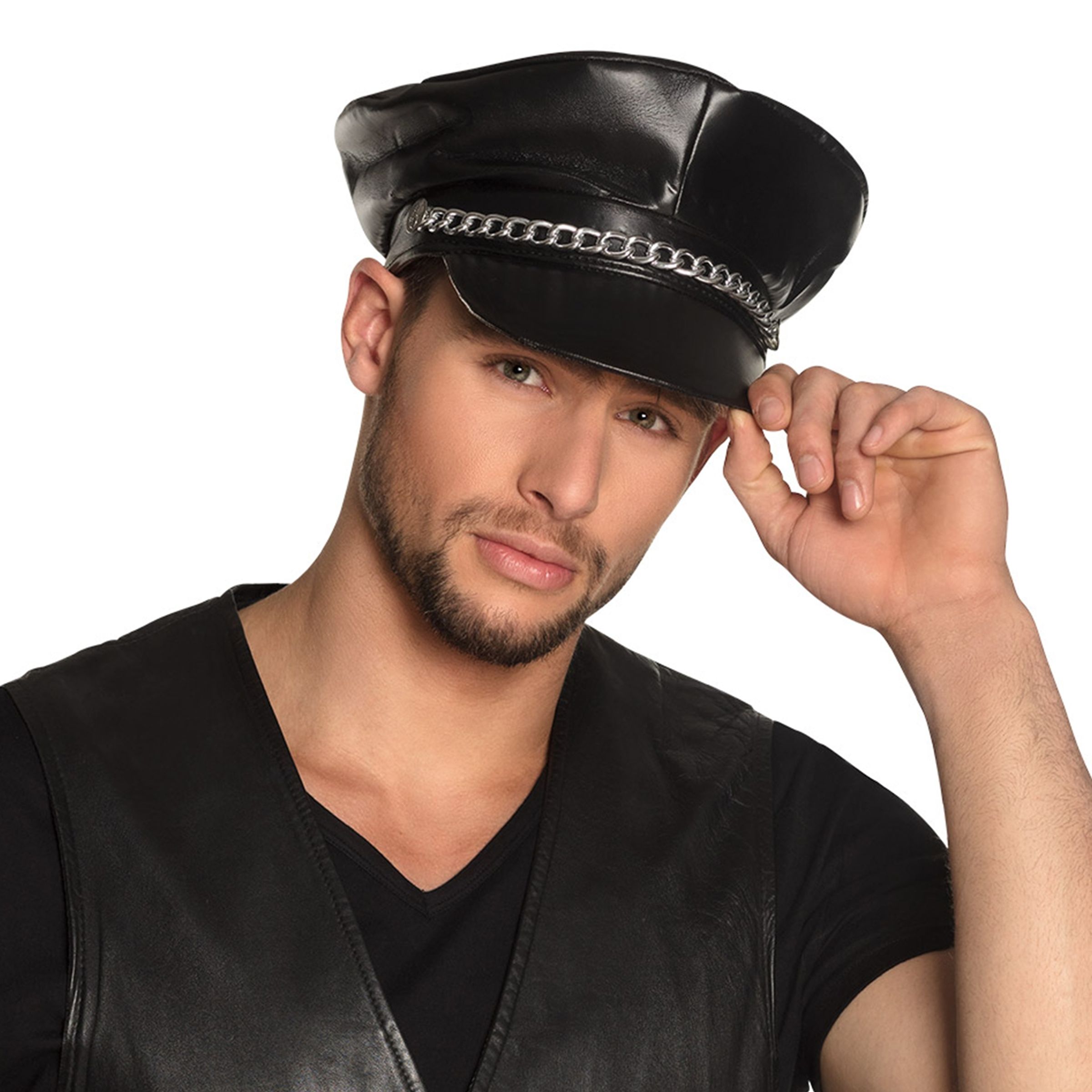 Svart Keps med Kedja är en svart keps i skinnimitation med skärm och silverfärgad kedja framtill. Perfekt huvudbonad till temafesten eller om du råkar ha en bad hair day!