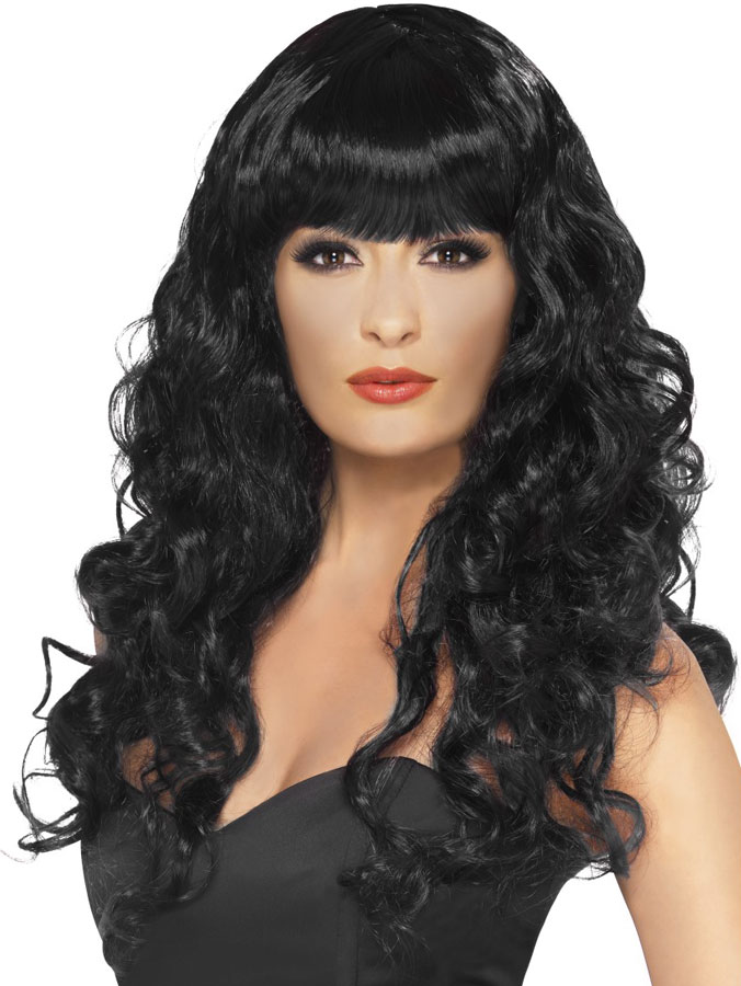 Svart Lockig Peruk Siren omfattar en lång peruk i svart design med lugg och eleganta lockar.