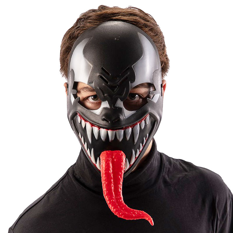 Häftig maskeradmask i svart med lång röd tunga som efterliknar den populära Marvel-karaktären Venom. Med denna snygga halloweenmask kan du enkelt skapa en super snygg utklädnad i häftig Venom-stil på ett riktigt enkelt sätt, matcha bara masken med en passande dräkt så är du klar för både maskerad och halloween.