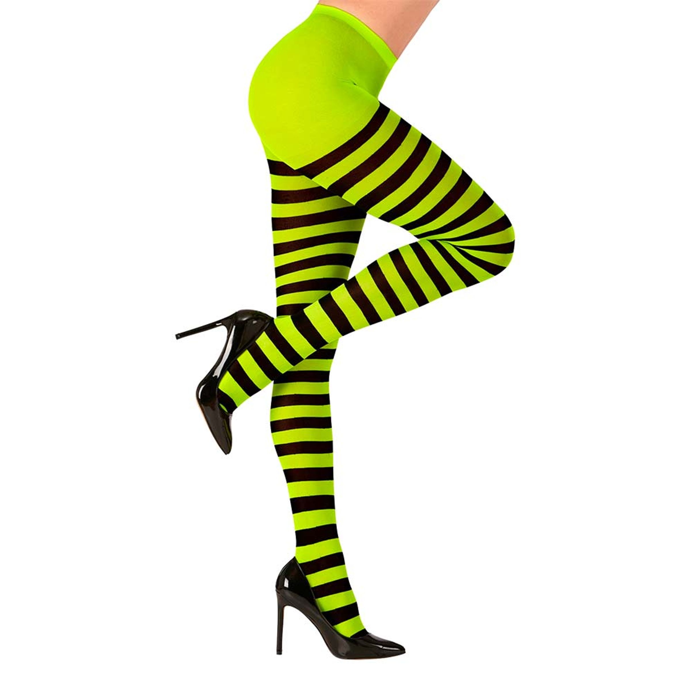 Låt dina spiror förvandlas till ett par randiga i dessa fräsiga strumpbyxor i läcker neongrön och svart färg. Ett säkert kort att bära när du känner att du vill sticka ut lite extra på jobbet eller på maskeraden!