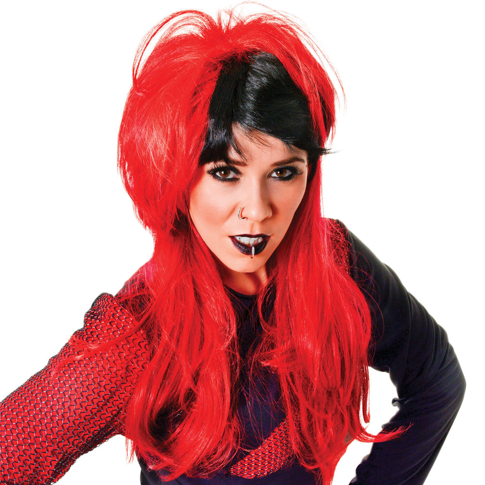 Skaffa dig en häftig punk frisyr riktigt enkelt med hjälp av denna häftiga punk maskerad peruk! Med det långa röda hårsvallet och den tuffa svarta luggen får du precis rätt utseende för att bli festens tuffaste punk-tjej. En perfekt maskerad peruk för dig som är ute efter dem ultimata tillbehören till din punk maskerad utklädnad.