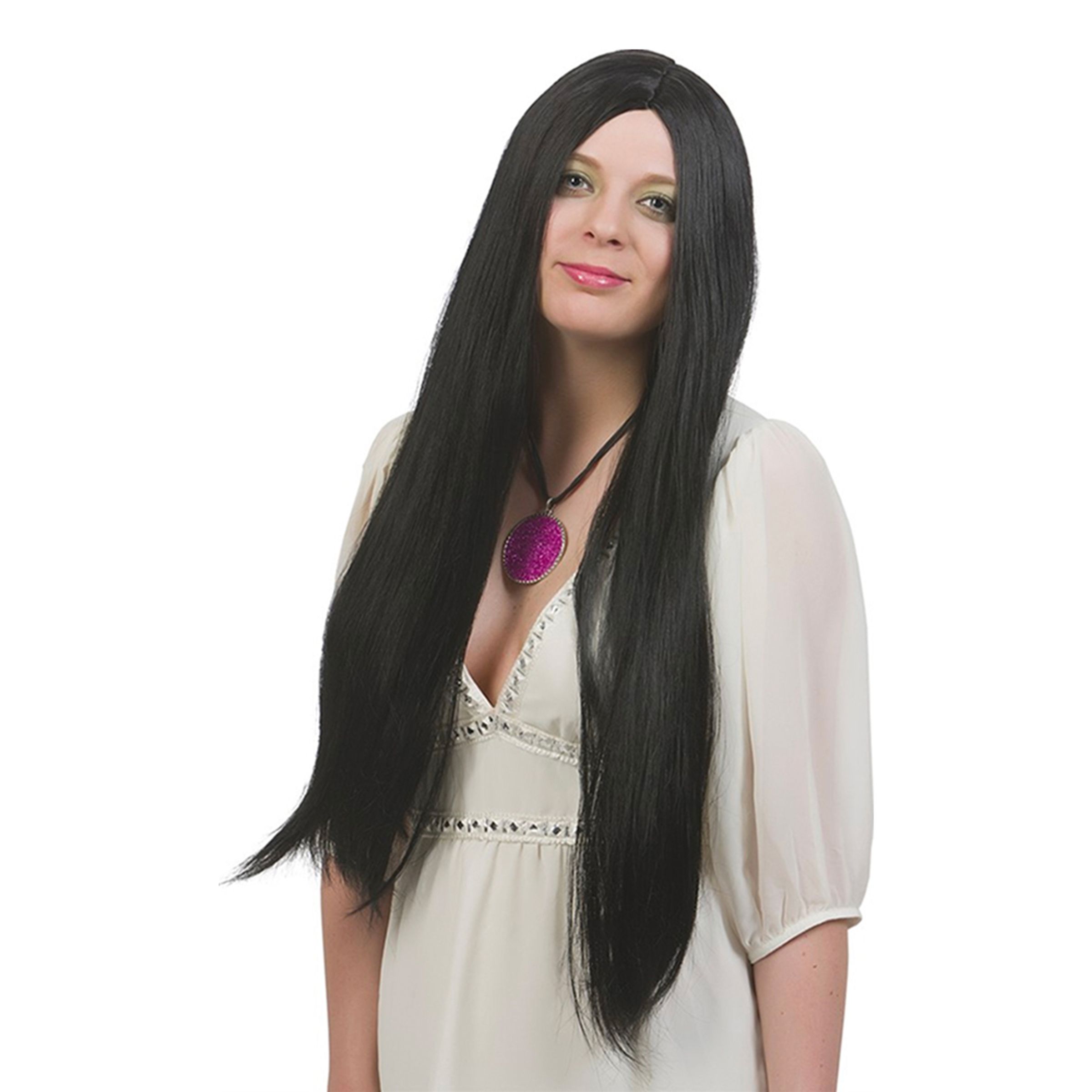 Svart Peruk Lång är en peruk med långt blankt, svart hår. peruken finns i storlek vuxen (one-size) och är tillverkad i polyester. Levereras styckvis.