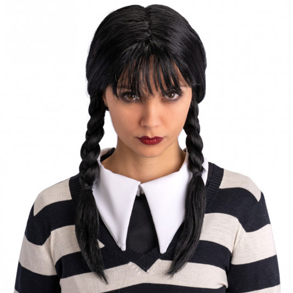 Med denna svarta peruk med flätor och lugg blir du lika ikonisk som karaktären Wednesday Addams. Designad att se strålande ut och att bjuda på lekfull karaktärsförvandling. Ta plats i rampljuset på maskeraden, halloweenfesten eller vid cosplay-eventet med denna framstående syntet-peruk.