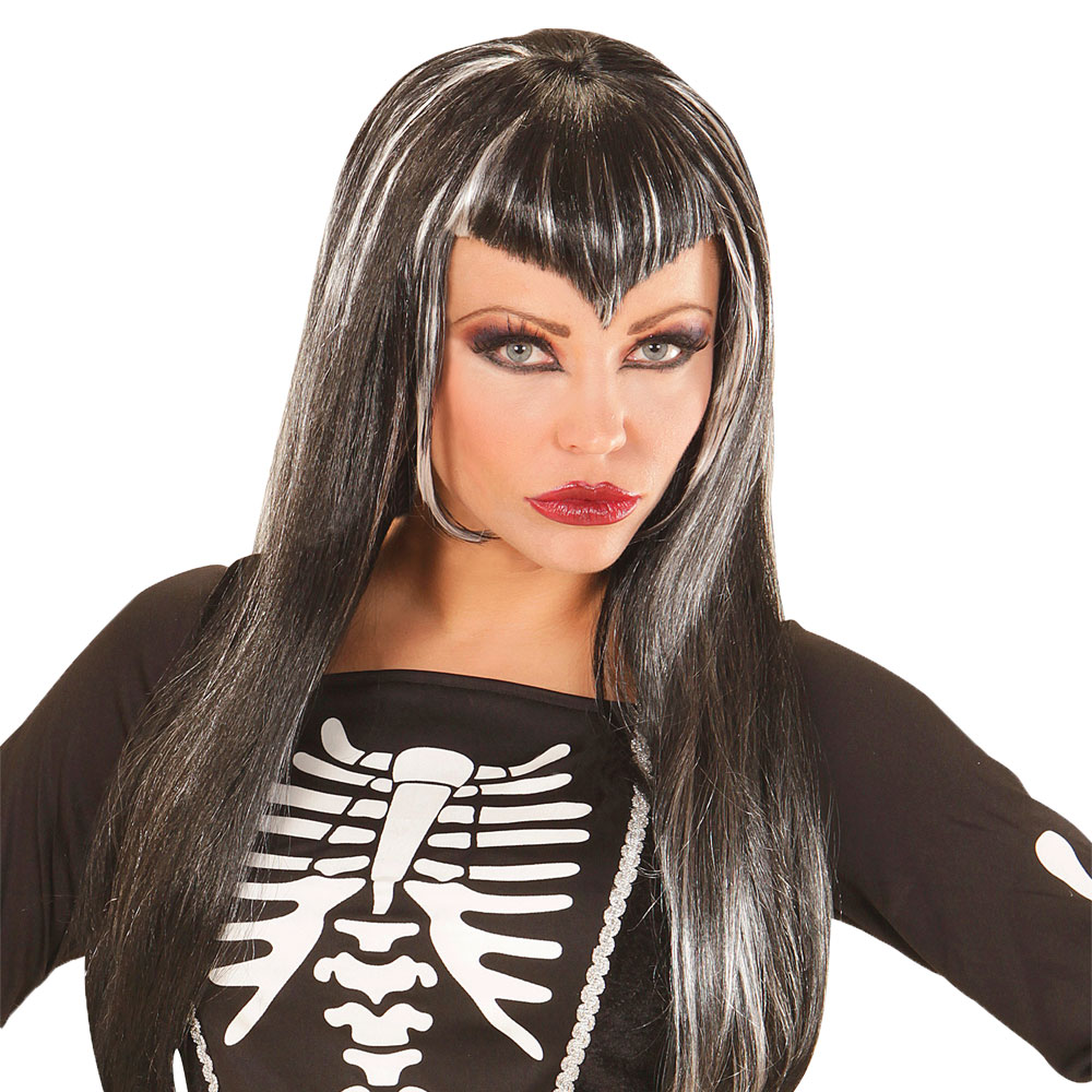 Svart Peruk Skeletria omfattar en svart peruk med vita slingor och lugg. Tillverkad av polyester och passar vuxna.