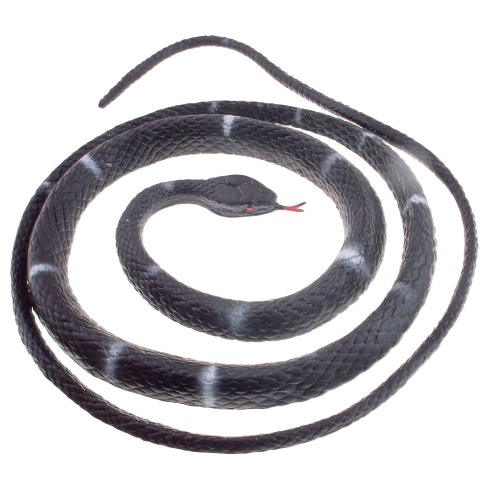 Svart Plastorm omfattar en svart plastorm med vita detaljer och röd utstickande tunga. Ormen är tillverkad av plast och är ca 95 cm lång.