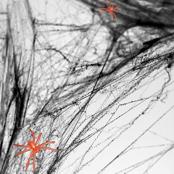 Svart Spindelnät består av 60 gram svart spindelnät och två spindlar i en snygg orange färg. Nätet går utmärkt att töja och dra isär för att skapa coola effekter.
