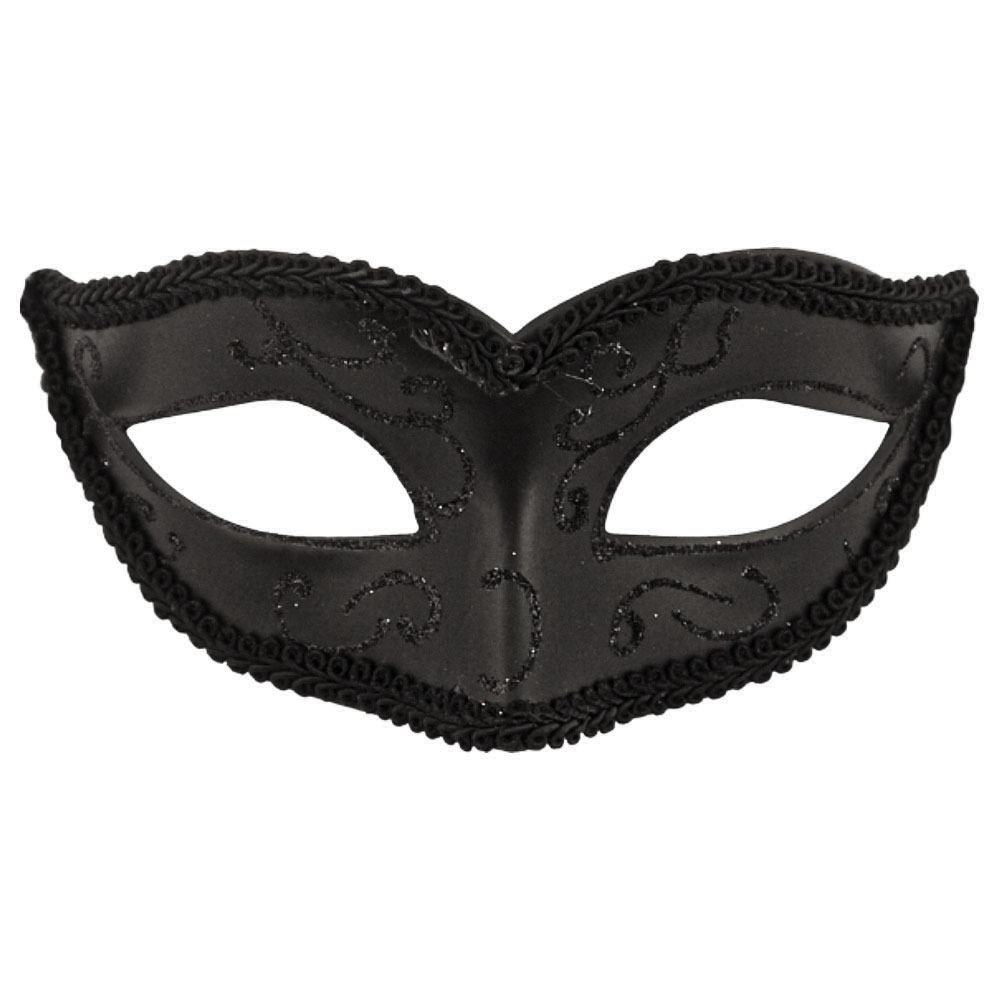 Svart Teatermask innehåller en svart ögonmask med glittrigt mönster och svart band längst kanten. Masken har även svarta band på sidorna som knyts runt huvudet för att hålla den på plats.