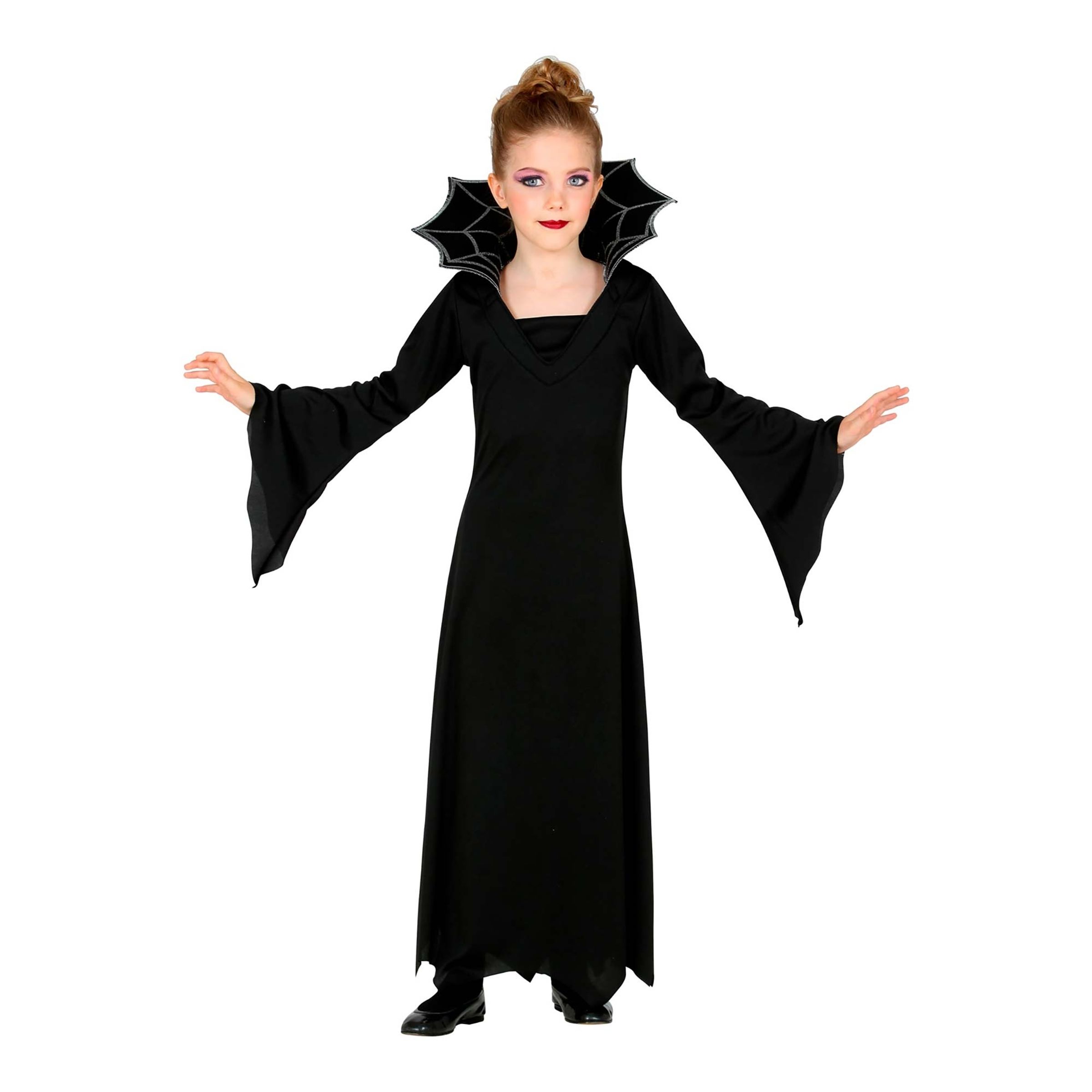 Svart Vampyra Barn Maskeraddräkt inkluderar en svart långklänning med vida ärmar. Det ingår även en stående krage i svart med silvriga detaljer att ha runt nacken. Perfekt till halloweenfesten!